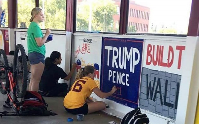 umn-original-mural-navigate-mn Single story posts page footer widgets mobileYour Source For Independent Media – No Ads or Paywalls – Viewer Supported Members of UMN College Republicans painting their designated panels with TRUMP/PENCE 2016 and BUILD THE WALL