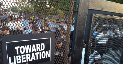 Large groups of people representing a wide array of political ideologies were once again congregated at the gates of the security perimeter. This created quite a mix of tactics. Some were burning sage and singing, others were burning flags and yelling. A group walked a coffin representing the DNC around the crowd on a candlelight procession and tossed it over the security fence.