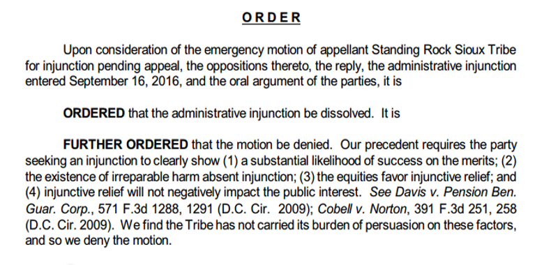 Washington, DC- A panel of federal judges on the U.S. Court of Appeals D.C. Circuit ruled to deny the Standing Rock Sioux Tribe’s request for an injunction to stop construction of the Dakota Access Pipeline (DAPL). Lawyers representing the tribe had argued that DAPL construction presented a threat to ancient sacred burial sites in the area, a condition which the federal appeals court contends has not been met.