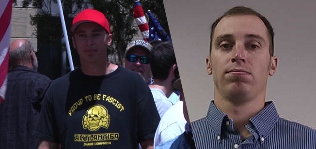 Two images of William Planer. On left, at a Proud Boys rally in Colorado wearing a black shirt with text “Proud to be fascist, anti-antifa”. On right, mug shot of WP after his recent arrest.