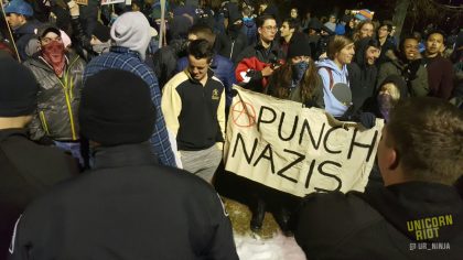 Active resistance to white nationalism, the “alt-right”, and anyone currently lining up with fascist nazi ideology was a theme throughout the inauguration, starting with the large disruption of the Deploraball the previous evening.
