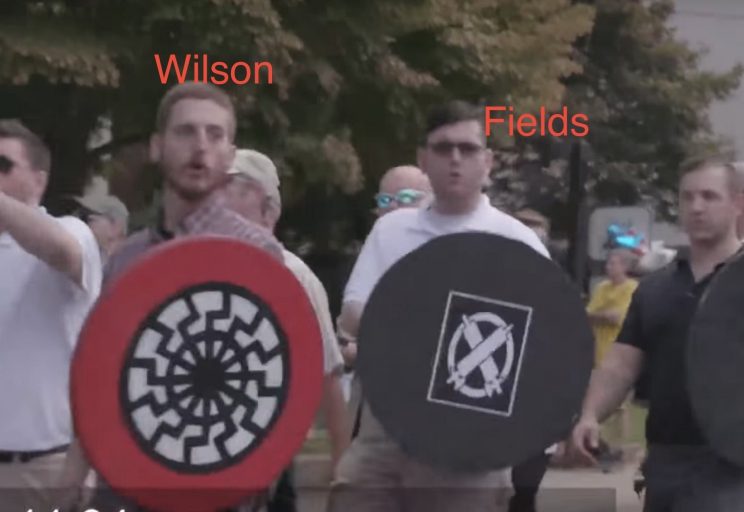 Charlottesville car attacker James Alex Fields, set to go on trial for federal hate crime charges in November, was seen marching with a Vanguard America shield before he later ran his car into a crowd of demonstrators. Video footage from Charlottesville on August 12 shows James Alex Fields and Taylor Wilson marching side-by-side each carrying a wooden shield. The red shield carried by Wilson, emblazoned with the neo-Nazi ‘black sun” or “sonnenrad” symbol, was part of a batch of shields believed to be distributed by Robert ‘Azzmador‘ Ray, a Texan neo-Nazi propagandist closely tied to The Daily Stormer, a prominent hate site.