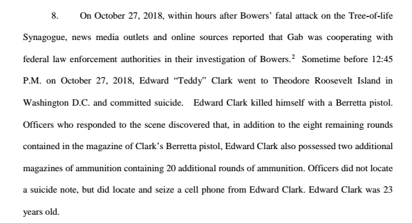 Shortly before the outbursts leading to his arrest, Clark’s brother, Edward Clark, committed suicide. According to the federal affidavit, Edward killed himself upon learning that Gab was cooperating with the police upon Bowers’ arrest.