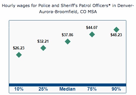 DPD didn’t comply with our records requests, so we were unable to find out the exact amount of money the city pays officers to assist in sweeps, however according to the graph below, the average hourly wage for police and sheriff’s patrol officers in Denver, Aurora and Broomfield, CO is $37.86.