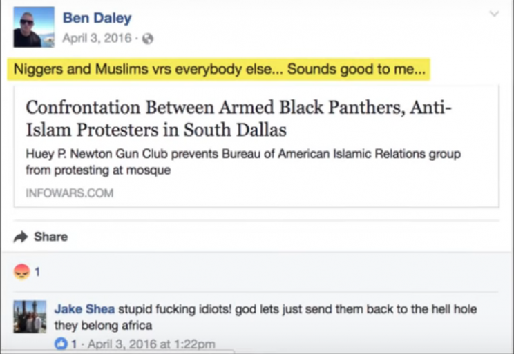 Daley was also present in the Discord chat server used to plan Unite The Right. He described traveling to Charlottesville with “3 Goys from CA” who he described as “experienced,” adding they “all were in Berkeley riots.”