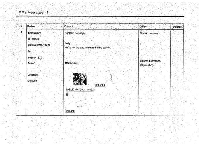 Virginia state prosecutors also showed jurors a text exchange between James Alex Fields and his mother on the day before the rally. After his mom told him to be careful, Fields replied “we’re not the ones who need to be careful” with a picture of Adolf Hitler attached.