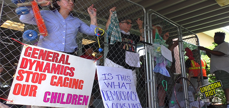 We are here today because General Dynamics provides support services to the family separation and detention process. General Dynamics profits from the caging of children, and we demand that this despicable process ends now. We will not tolerate it. We stand here today because immigration is not a crime.”