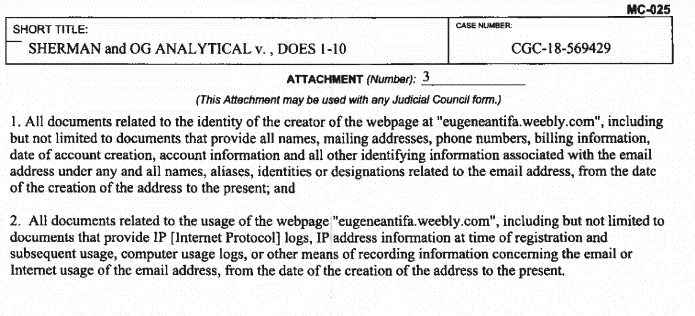 Sherman’s defamation suit now claims that Eugene Antifa made “false statements … for the sole purpose of interfering with” the “prospective business relationships” of OG Analytical, Sherman’s weed testing company. A subpoena to Weebly, a web company which had hosted a now-offline website for Eugene Antifa, was filed in the Superior Court of California in San Francisco. The subpoena seeks to identify anyone tied to Eugene Antifa’s account and names 10 John and Jane Does as defendants. Defense counsel for Eugene Antifa accused Sherman of “venue shopping” because “plaintiff Sherman is an Oregon resident, her business was based in Eugene, OR, and the article was posted on the Eugene Antifa website makes it puzzling that plaintiffs claimed that all of their injuries occurred in San Francisco…it is clear that the only connection to San Francisco is Weebly, Inc., which is based out of San Francisco.”