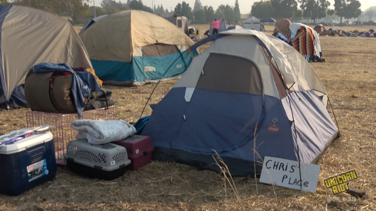 On Sunday afternoon, Unicorn Riot live-streamed footage from the Chico Walmart parking lot. No FEMA raid occurred, however many evacuees moved their tents from the Walmart parking lot to the open field next to it, and the large tent encampment is still there and occupied by many people.