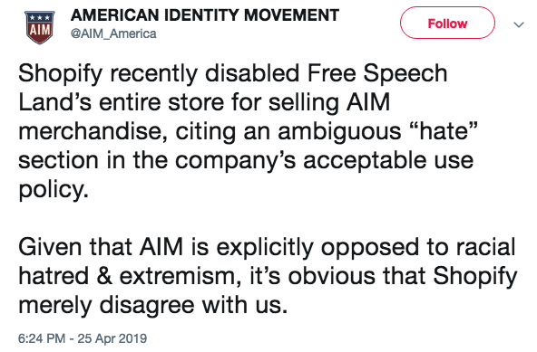 Casey also cited the fact that the American Identity Movement was able to sell shirts online as evidence of his strategic wisdom guiding the group to success. He was referring to Free Speech Apparel, a right-wing political clothing website that partnered with ‘AIM’ right after its launch to sell hoodies printed with the group’s logo. On April 25, the American Identity Movement’s Twitter account posted that “Shopify recently disabled Free Speech Land’s entire store for selling AIM merchandise“. Free Speech Apparel seems to be back in business but the link for ‘AIM’ merchandise on their site now leads to a dead page.