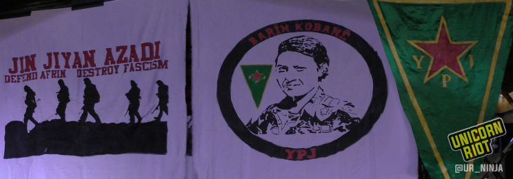 Tables below the banner were covered with free feminist and anti-fascist patches and artwork. There were pamphlets about the Rojava revolution, the Peoples’ Protection Units, and the International Freedom Battalion of the YPG. Flyers were present also for a Rojava solidarity rally that had been scheduled to take place the next day, on International Kobane Day.