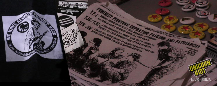 The intersection of anti-fascism and militant feminism is exemplified in the YPJ, the female-only branch of the Rojava Peoples’ Protection Units. “Feminist fighters defeating fascism and patriarchy” was the title of one informational flyer.