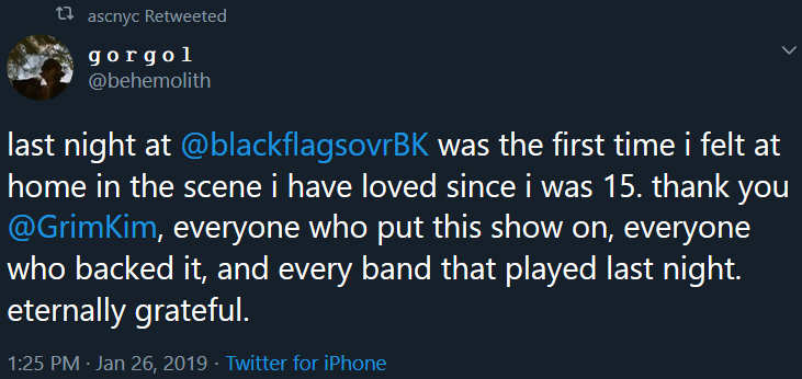 (ASC reported that no harassment took place that they had been made aware of. After the festival’s end they re-tweeted an attendee’s grateful message to the event organizers, “last night at @blackflagsovrBK was the first time i felt at home in the scene i have loved since i was 15.“)