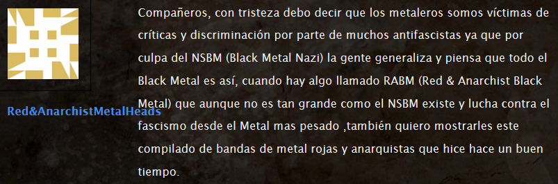 “la gente generaliza y piensa que todo el Black Metal es asĂ, cuando hay algo llamado RABM (Red & Anarchist Black Metal) que aunque no es tan grande como el NSBM existe y lucha contra el fascismo desde el Metal mas pesado […]“