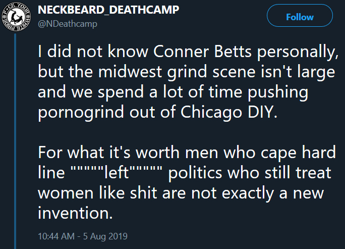 (Recently the conversation about art vs. artist is resurfacing surrounding the killer responsible for the mass shooting on August 4, 2019 in Dayton, Ohio. The shooter has been identified as a member of a misogynistic band who makes music about raping and slaughtering women. The gunman killed nine people, including his own sister, and injured over ten more. Neckbeard Deathcamp disavowed the shooter as a “scene rapist” tweeting on August 5, “For what it’s worth men who cape hard line “””””left””””” politics who still treat women like shit are not exactly a new invention.“)