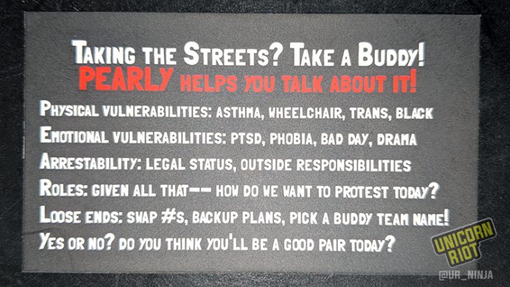 One of the panels on Sunday we were able to attend was on personal health & safety while at protests. The panelists spoke about basic ways to evaluate with buddies before choosing to take part in actions, and taught attendees the “PEARLY” mnemonic device: