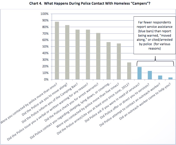 - “This policing has led many homeless individuals to refrain from use of personal shelter, resulting in dangerous exposure to weather: Among those who have been instructed by police to quit using shelter from the elements, there is a higher rate of frostbite, dehydration, and heat stroke.”