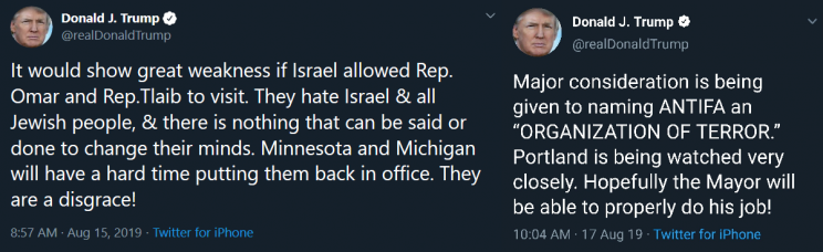 Trump has also floated the idea of crackdowns against anti-fascists and political activists. Two days after he made the August 15 statement against Rep. Omar, Trump tweeted about “naming ANTIFA an ‘ORGANIZATION OF TERROR.’” The tweet came the same day as a 2019 far-right rally in Portland, Oregon.