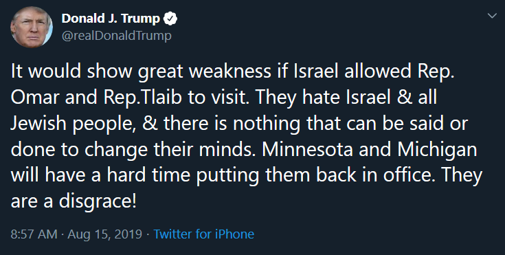 Rep. Omar has been a high profile political target for Trump, who has alleged both anti-Semitism and a lack of patriotism against her. The charges of anti-Semitism seem to be an attempt to punish Rep. Omar’s support for the Boycott – Divest – Sanctions (BDS) movement and her support for human rights in general. This past summer Trump personally encouraged Israel’s prime minister, Benjamin Netanyahu, to ban Representative Omar from entering Palestine, tweeting on August 15 that it would show “great weakness” if Netanyahu allowed the Minnesota politician to visit Palestine. In August of 2019, both Rep. Omar and Rep. Tlaib were blocked from visiting Israel.
