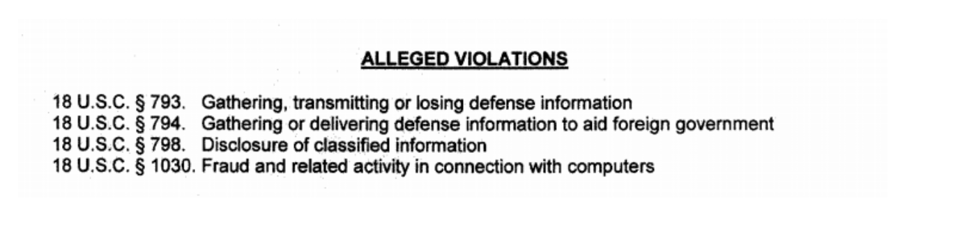 FBI alleged that there may have been violations of 18 U.S.C. § 793, 794, 798 and 1030 – espionage and computer hacking. Assange is currently charged on unrelated matters under 18 U.S.C. 793 and 1030. The description of the FBI Briefing in the Investigation Summary section of the document is completely redacted in both versions, though the Forensic Analysis section reveals that the FBI was able to give NARA a CD containing copies of the files which they believed had been compromised by a ‘WikiLeaks Breach’ of NARA’s networks.