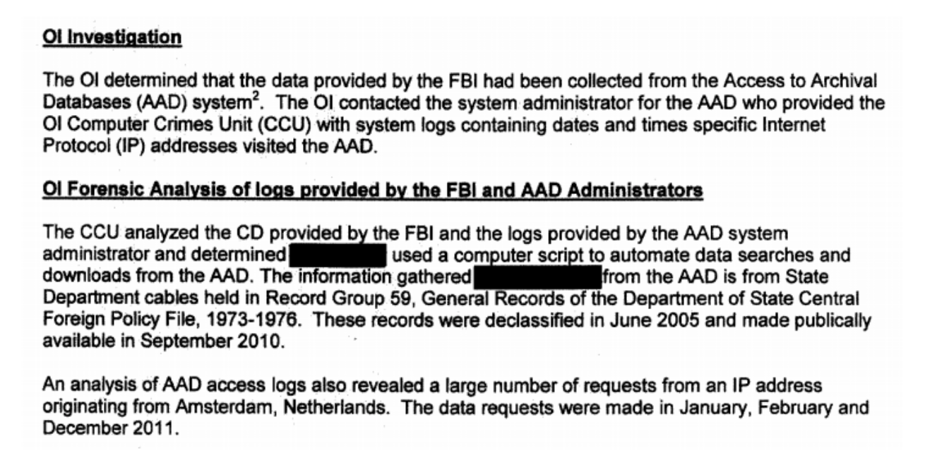 NARA’s report confirms that the files were the State Department cables and that they “were declassified in June 2005 and made publically [sic] available in September 2010.” The report also confirms that the files were downloaded from NARA’s public website in January, February and December 2011 by “an IP address originating from Amsterdam.”