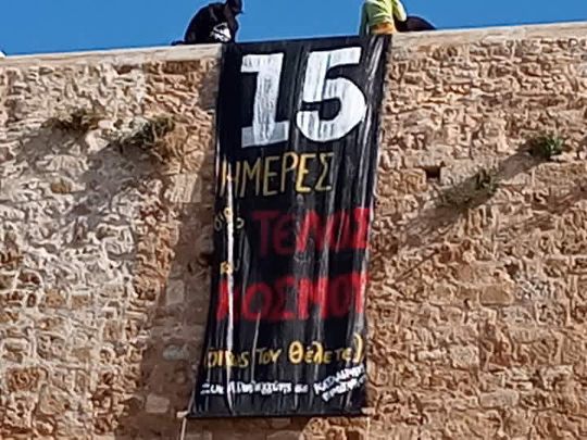During a protest in Thessaloniki against the government’s ultimatum, a massive banner was hung at the trade union center.
