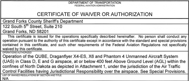 According to documents Unicorn Riot received from the FAA, the Grand Forks County Sheriffs were operating QUBE, Draganflyer X4-ES, X6, and Phantom 4 unmanned aircraft systems (UAS) in Class D, E, and G airspace.