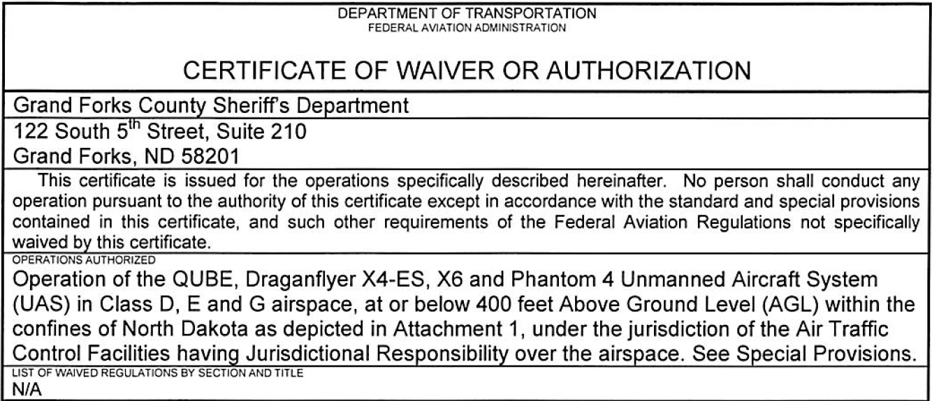 According to documents Unicorn Riot received from the FAA, the Grand Forks County Sheriffs were operating QUBE, Draganflyer X4-ES, X6, and Phantom 4 unmanned aircraft systems (UAS) in Class D, E, and G airspace.