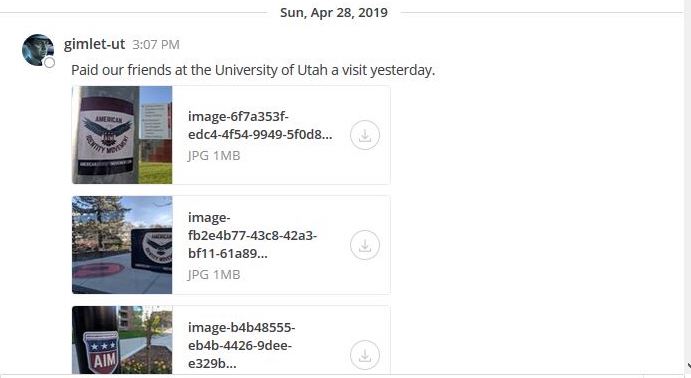 On April 28, a member using the chat alias ‘Gimlet‘ posted that he had spent the previous day, April 27, posting flyers at the University of Utah. ‘Gimlet‘ is an alias that shows up in both leaked Identity Evropa Discord logs as well as the American Identity Movement’s MatterMost chat.