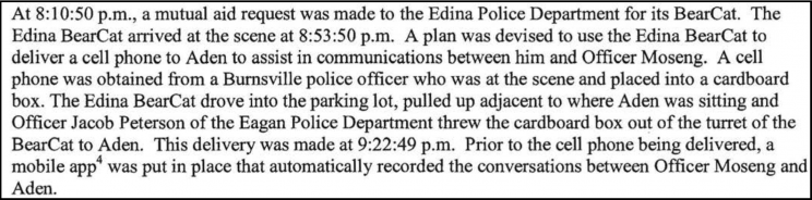 The “tactical plan” was initiated 2 minutes and 19 seconds into Moseng’s phone call to Aden. Police on the ground, in the BearCat, and snipers on the roof all shot at Aden with a variety of less-lethal munitions and then live fire.