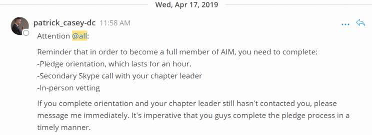 MatterMost chats, screenshots of which have been obtained for this report, are used in the process of recruiting and vetting “pledge” members for entry into full membership in the group. IE/AmIM does not allow people of non-white or Jewish descent to join and now requires in-person vetting before full membership is granted.