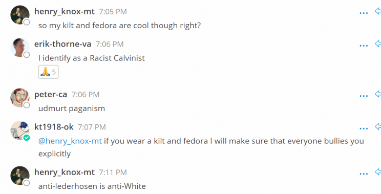Since being kicked off the chat programs Discord and Slack, Identity Evropa/American Identity Movement has switched to using a chat software called MatterMost to host national-level chats among its membership. However, MatterMost doesn’t support voice functionality for large groups, so IE/AmIM still uses temporary Discord servers created and deleted on a weekly basis to hold meetings.