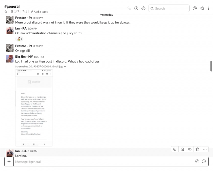 Pledges are officially instructed to keep all ‘extremist’ content and illegal activities off the Identity Evropa chat servers. Casey doesn’t explicitly disavow his members from posting ‘extremist’ comment, but advised them that “if you’re [sic] shitposting on a non-IE server gets so out of hand that I have to hear about it, then that’s a problem. I don’t want to hear about it“. Many IE members belong to other leaked chats, where they are much more open to posting explicitly racist and fascist comments. This doesn’t seem to be an issue with Casey, who commented, “If you make it a server and invite IE people to it, that’s not an official IE server. So I mean, you can kind of do whatever you want there”. Casey made these statements on Discord, a popular chat platform for gamers, which recently banned all individuals associated with IE, in part because their accounts “sent threats to others, participated in targeted harassment, or incited violence against individuals and communities.”