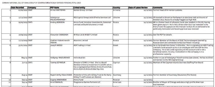 A July 2016 index of 22 “politically exposed persons” (PEPs) was provided to Unicorn Riot, which includes some prominent business-people involved in controversies and their families. According to the France-based Financial Action Task Force, a PEP is an “individual who is or has been entrusted with a prominent public function. […] [M]any PEPs are in positions that potentially can be abused,” including higher risks for money laundering, corruption, terrorism financing and bribery.