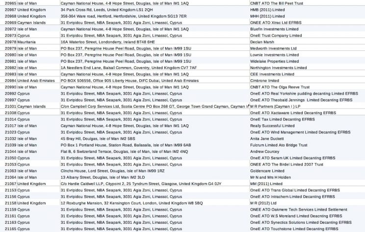 The XLS spreadsheet file, on its additional tabs, also includes detailed financial information about more than 3800 companies, trusts and individual accounts managed by Cayman National for clients around the world, including account balances.