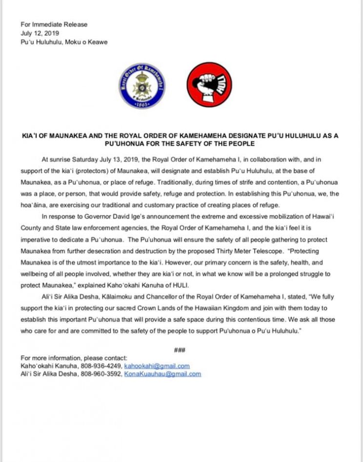 Since the Pu’uhonua was established on Maunakea, the Governor of Hawaii has instituted a state of emergency and deployed the National Guard. This most recent face-off is a continuation of an ongoing struggle by Kanaka Maoli Ohana against further desecration of their most sacred mountain, which already has 13 telescopes in place that also saw disputes. Today, the Kia’i continue decades of struggle to protect their mountain and are camped at its base watched by a mixture of law enforcement that includes police, sheriffs, and national guardsmen.