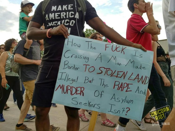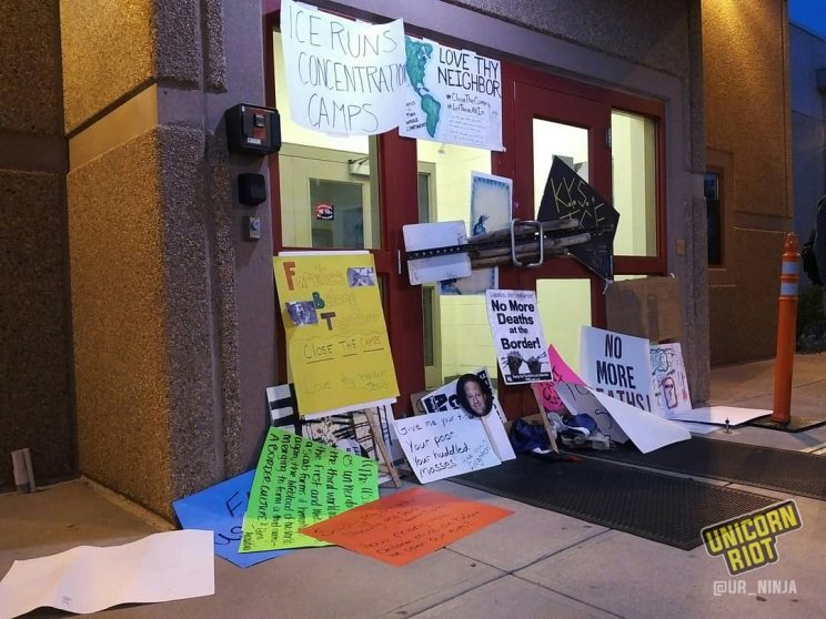 “It is absurd to equate peaceful occupation of federal property and the damage of three pieces of nylon with violence […] To those who argue that the radical protesters went too far and crossed a line, we disagree. Using respectability politics to denounce actions taken by and alongside impacted immigrants and people of color is shameful, divisive, and plays into the hands of authorities who prefer a quiet and complacent public.”
