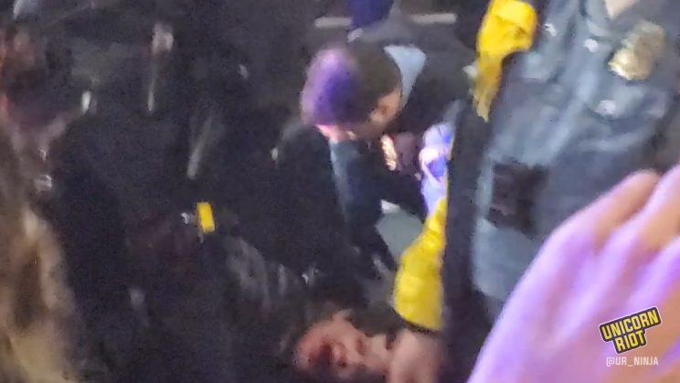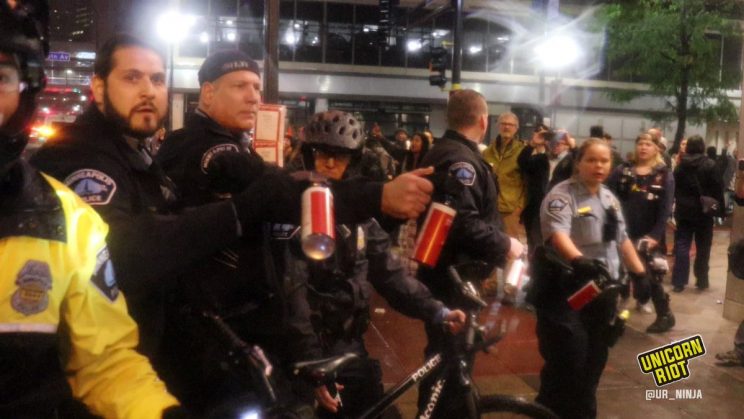 An MPD officer clearly targeted a Unicorn Riot (UR) videographer with multiple blasts of pepper spray. Another UR videographer also received a dousing of the chemical irritant.