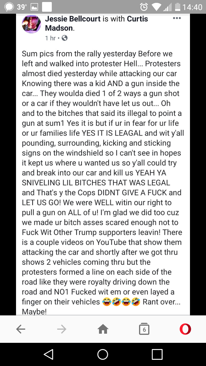 The next day a woman named Jessie Bellcourt was observed on Facebook boasting that protesters “almost died yesterday“, and how MPD didn’t care that her passenger Curtis Madson had used his firearm to threaten anti-Trump demonstrators.