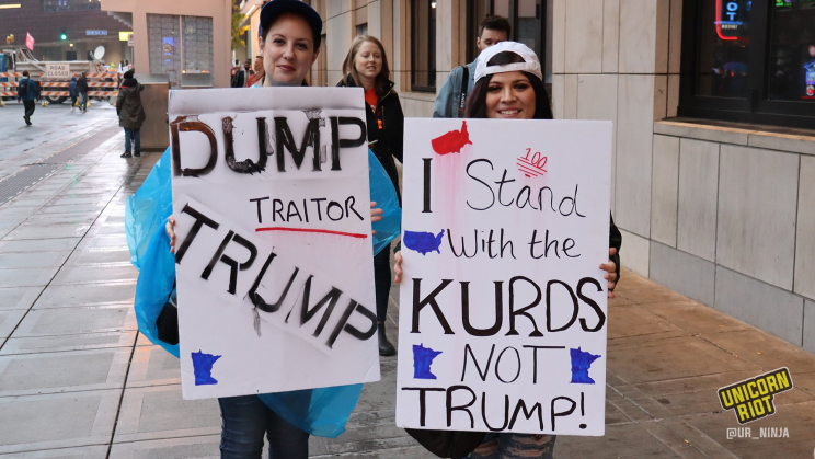 Several people we interviewed live said they were out protesting Trump because of his betrayal of the Kurdish people this past week, with his deal allowing the Turkish Army to proceed into Northern Syria.