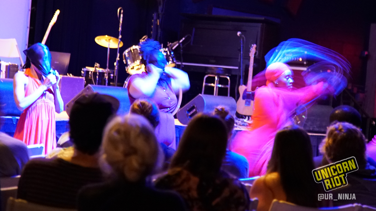 Left: featured artist Deja Stowers & dance company BLAQ. Center: avant-garde band The Ritual provided ambiance between artist sets. Right: featured artist Pedro Doña Pepa mid-performance. (August 2019)