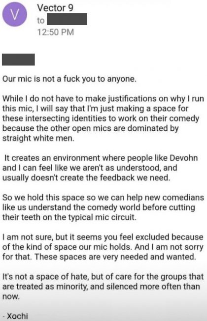 Xochi responded, “While I do not have to make justifications on why I run this mic, I will say that I’m just making a space for these intersecting identities to work on their comedy because the other open mics are dominated by straight white men.” They clarified that it was a nurturing space for members of groups that are “treated as minority” and get silenced more often than amplified, rather than a “space of hate.”