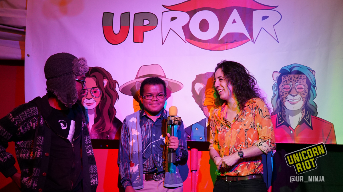 Three of the four Uproar co-producers at the Uproar Comedy Open Mic one-year anniversary: Madi RT, Devohn Bland, and Comrade Tripp (November 2019)