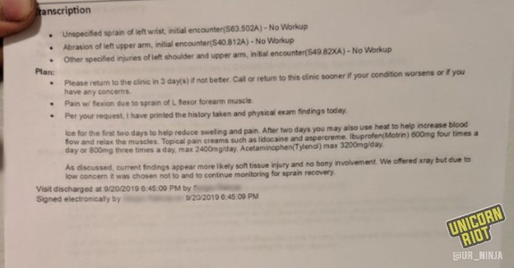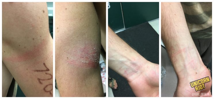 A few moments later, one of the commanding officers approached the passenger side door and immediately asked [name removed] where his “little mask” was, where his goggles were, and where his laser pointer was. They told Unicorn Riot about the incident: