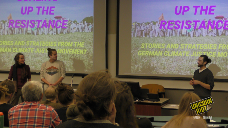 Minneapolis, MN – Dozens attended a presentation by German climate justice activists on mass mobilizations from the front lines of resistance to climate catastrophe.