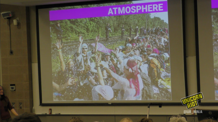 The Ende Gelände organizers began their presentation by highlighting that in Germany, “high school students who are on strike every Friday are the ones who are leading the movement right now, 25,000 students striking. A combination of radical direct action, massive civil disobedience, and more and more of the population joining the marches” is taking place every Friday in Germany, a country that simultaneously touts itself as “one of the ‘greenest’ most energy-efficient forward-thinking countries” while being the largest polluter in Europe; “40 miles outside of Bonn is Europe’s largest source of CO2.”