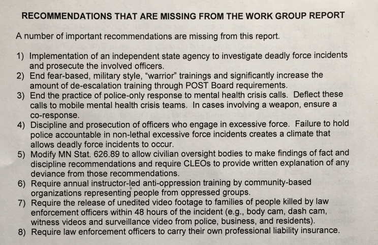 The community analysis of the Minnesota government’s report was provided by Black Lives Matter Twin Cities Metro, CUAPB, Disability Justice Network, Native Lives Matter, Racial Justice Network, TCC4J, and other local groups. Their analysis included a list of eight important recommendations that are missing from the working group’s report: