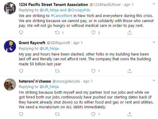 Unicorn Riot asked the Twitter community if they were participating in the April 2020 rent strike, and why. Three of the responses are seen below, all based on the fact that this crisis has made them unable to pay.