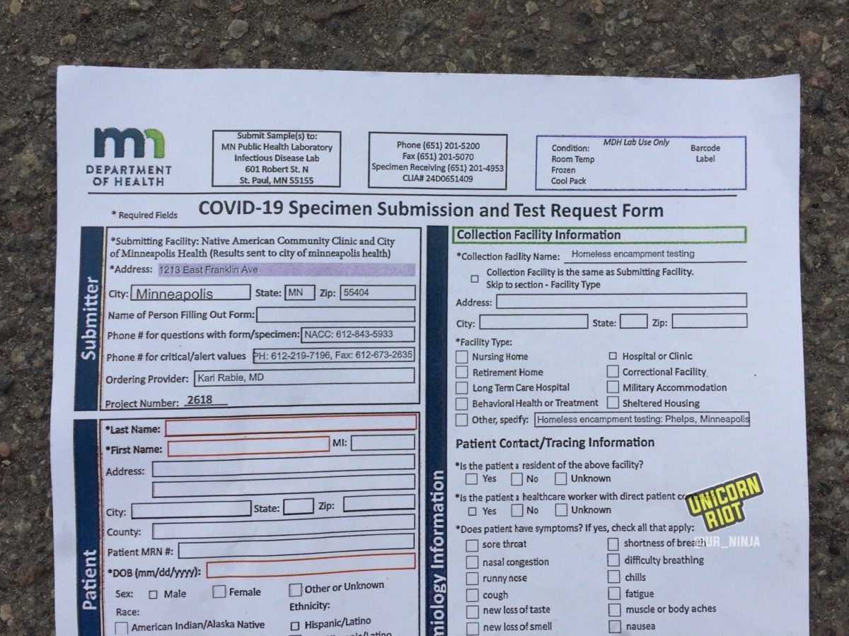 “Homeless encampment testing: Phelps, Minneapolis” was the name of the collection facility pre-printed on the Minnesota Department of Health’s COVID–19 “Specimen Submission and Test Request Form”. Phelps Park is the site of one of the many sanctuary encampments currently scattered across the city.