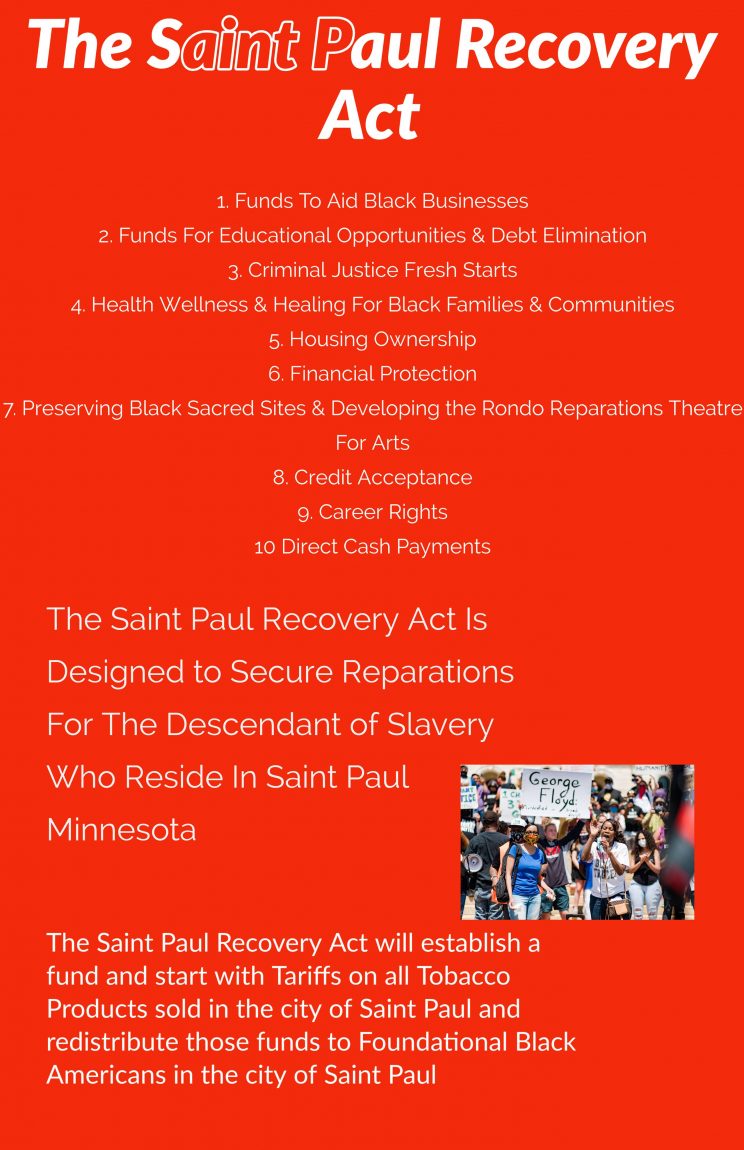 According to Crews the wealth gap in America is due to systemic racism. “Whites have 90% of the wealth and Blacks have under 3% of the wealth.” Following research conducted by Crews, the St. Paul Recovery Act is said to help eliminate the economic disparities.
